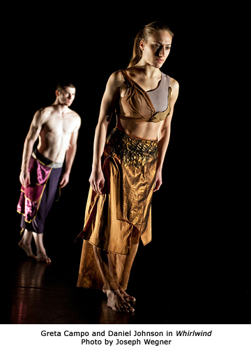 One of the highlights for me was seeing Ms. Chen’s earthy modern piece, Whirlwind, inspired by her journey on the Silk Road. It opens with six dancers standing still on stage, very subtly swaying forward and backward on the breeze. In this section, and throughout the piece, Ms. Chen used groups moving in unison, save for one dancer. These formations seemed to embody the phenomenon of the whirlwind, which she described in the program as coming from different directions. In the opening section, the dancers’ mostly remain in their spots, but they execute beautiful adagio movement with the upper body and the plie, creating the atmospheres of a coming storm. As the dance builds, influences of various cultures can be appear. The energy of the wind can be felt in contractions and sighing movement. I loved the section danced by the men, locked onto one another’s arms in a circle and swaying together in a way that seemed ancient and ritualistic. Great original movement in this dance and beautiful artistic execution by the dancers.
